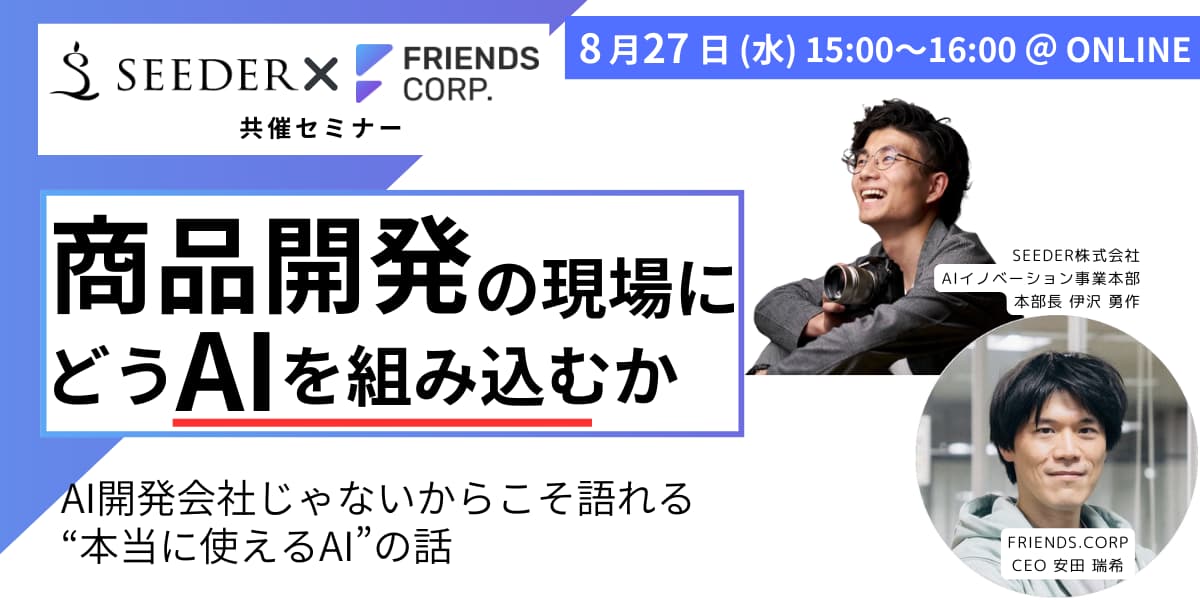 SEEDER株式会社(本社:東京都港区、代表取締役:武田知大、以下 SEEDER)は、2025年8月27日(水)に、フレンズ株式会社(本社:東京都中央区、代表取締役:安田瑞希、以下 FRIENDS)と共催で、オンラインセミナー「商品開発の現場にAIをどう組み込んでいくか〜AI開発会社じゃない。だからこそ語れる“本当に使えるAI”の話〜」を開催いたします。