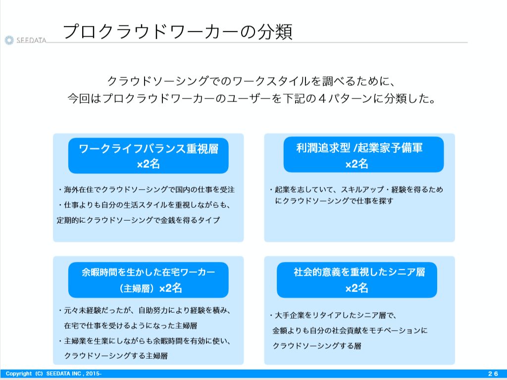 実際にSEEDATAでもマッチング系ビジネスや、クラウド上で何かをやる際にはこの考え方を活用していますし、ビジネスマン向けのサービスデザインや、これからの働き方を変える新規事業アイデアを作りたいという人は、プロクラウドワーカーを使うことをオススメします。